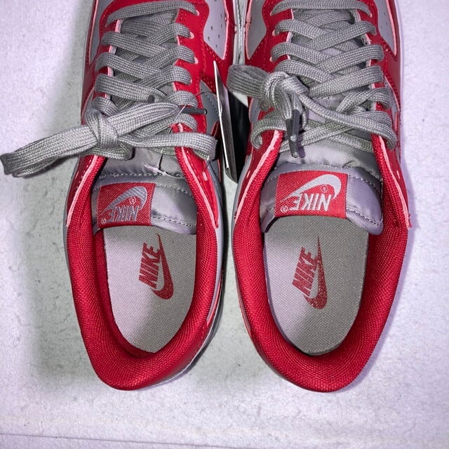 アッパーはユニバーシティレッドとソフトグレーの重厚なコントラストを描き、ヒールには特大の"NIKE"ロゴが鎮座する。