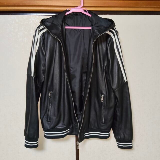 フード部分と両肩部分に3本ラインのデザインが施されたレザーパーカーです。