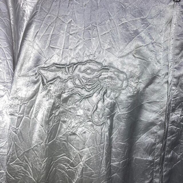 光沢のあるシルバーカラーのシワ加工生地に、ホワイトカラーのトラの刺繍が、フロント左右と、バックに施してあります。