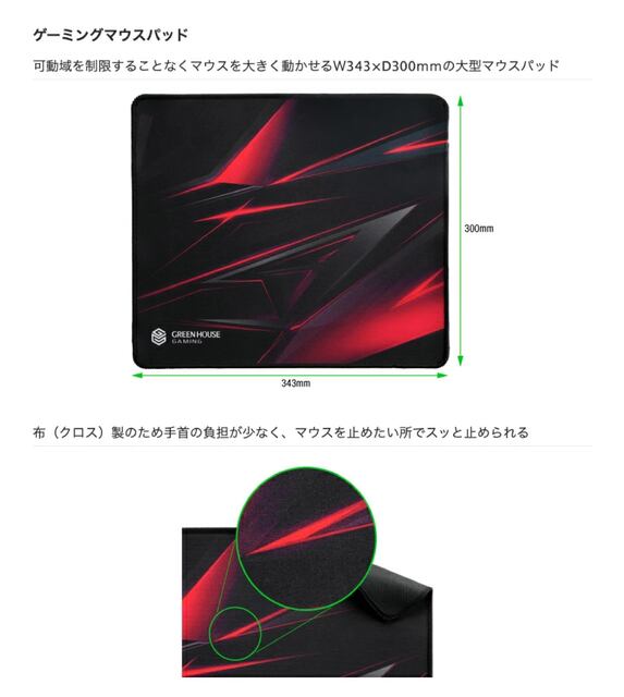 【ゲーミングマウスパッド】可動域を制限することなくマウスを大きく動かせるW343×D300mmの大型マウスパッド/布(クロス)製のため手首の負担が少なく、マウスを止めたい所でスッと止められる