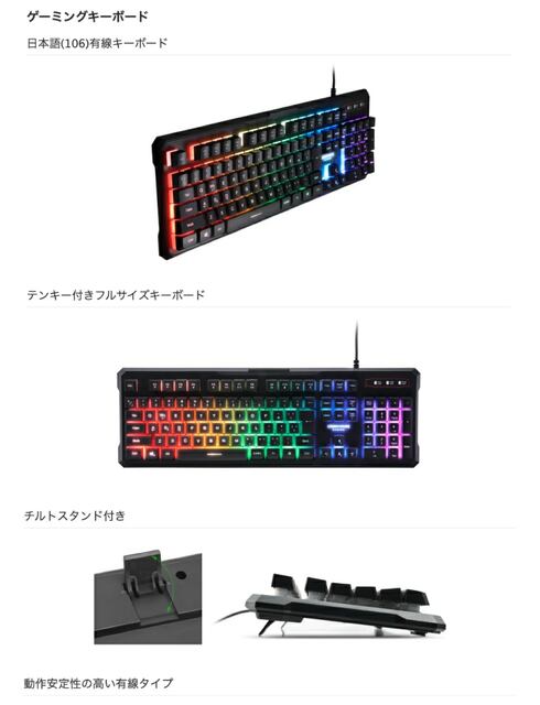 【ゲーミングキーボード】日本語(106)有線キーボード/動作安定性の高い有線タイプ/テンキー付きフルサイズキーボード/子供でも入力しやすいメンブレンキーを採用/チルトスタンド付き