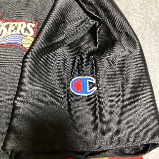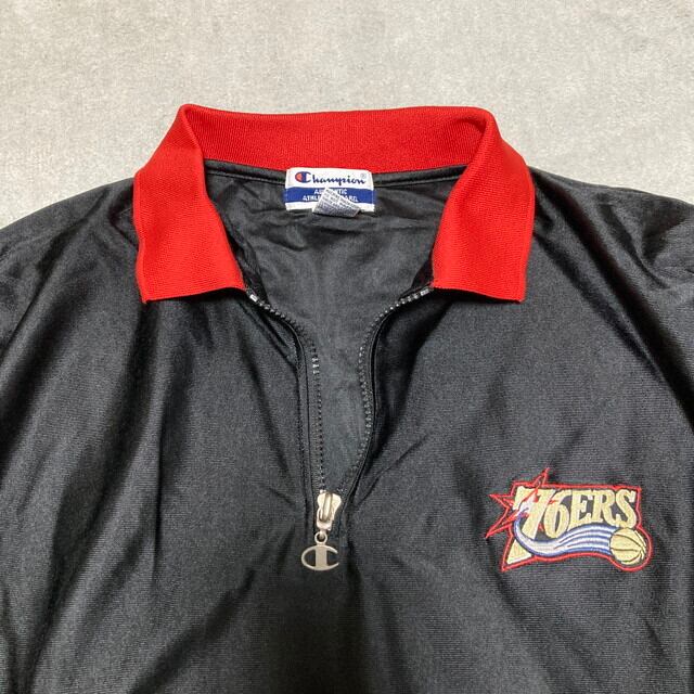 古着 NBA champion チャンピオン Philadelphia 76ers フィラデルフィア セブンティシクサーズ ハーフジップシャツ ポロシャツ ウォームアップシャツ 半袖 ブラック レッド ワッペン 刺繍 メンズ Lサイズ 韓国製
