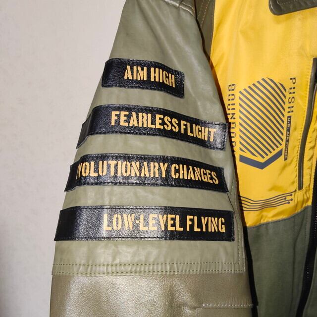 avirex アヴィレックス レザージャケット 羊革 シープレザー アーミーメカニックジャケット グリーン カーキ イエロー 緑 黄色 レザーパッチ メンズ Lサイズ 超美品!