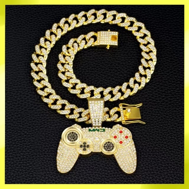 ゲームコントローラー ブリンブリン ギラギラ ゴールド マイアミキューバンリンク ジルコニア CZダイヤモンド ラインストーン ネックレス ペンダント ヒップホップ パンク ストリート 13mm 50cm メンズ レディース ユニセックス 新品未使用品