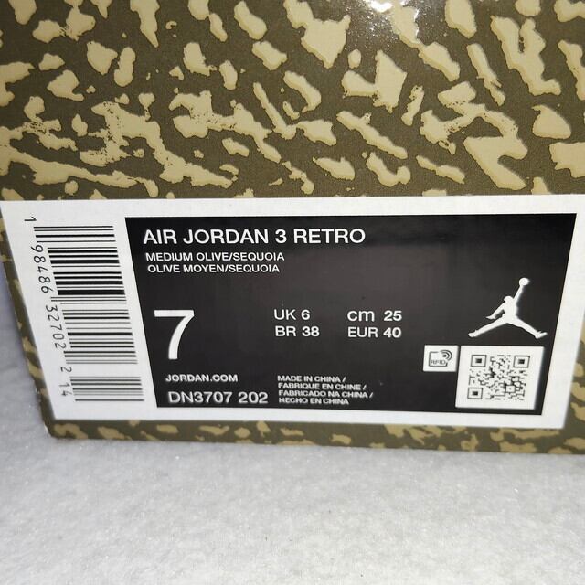 nike air jordan 3 retro medium olive / sequoia size7 25cm