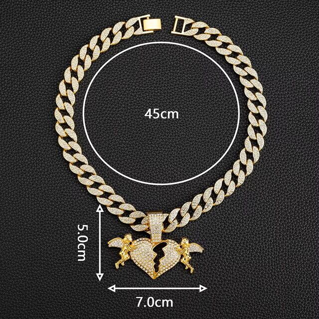 ハートブレイク ブロークンハート 天使 ブリンブリン ギラギラ ゴールド 金 マイアミキューバンリンク ジルコニア CZダイヤモンド ラインストーン ネックレス ペンダント ヒップホップ 15mm×45cm メンズ レディース ユニセックス 新品未使用品
